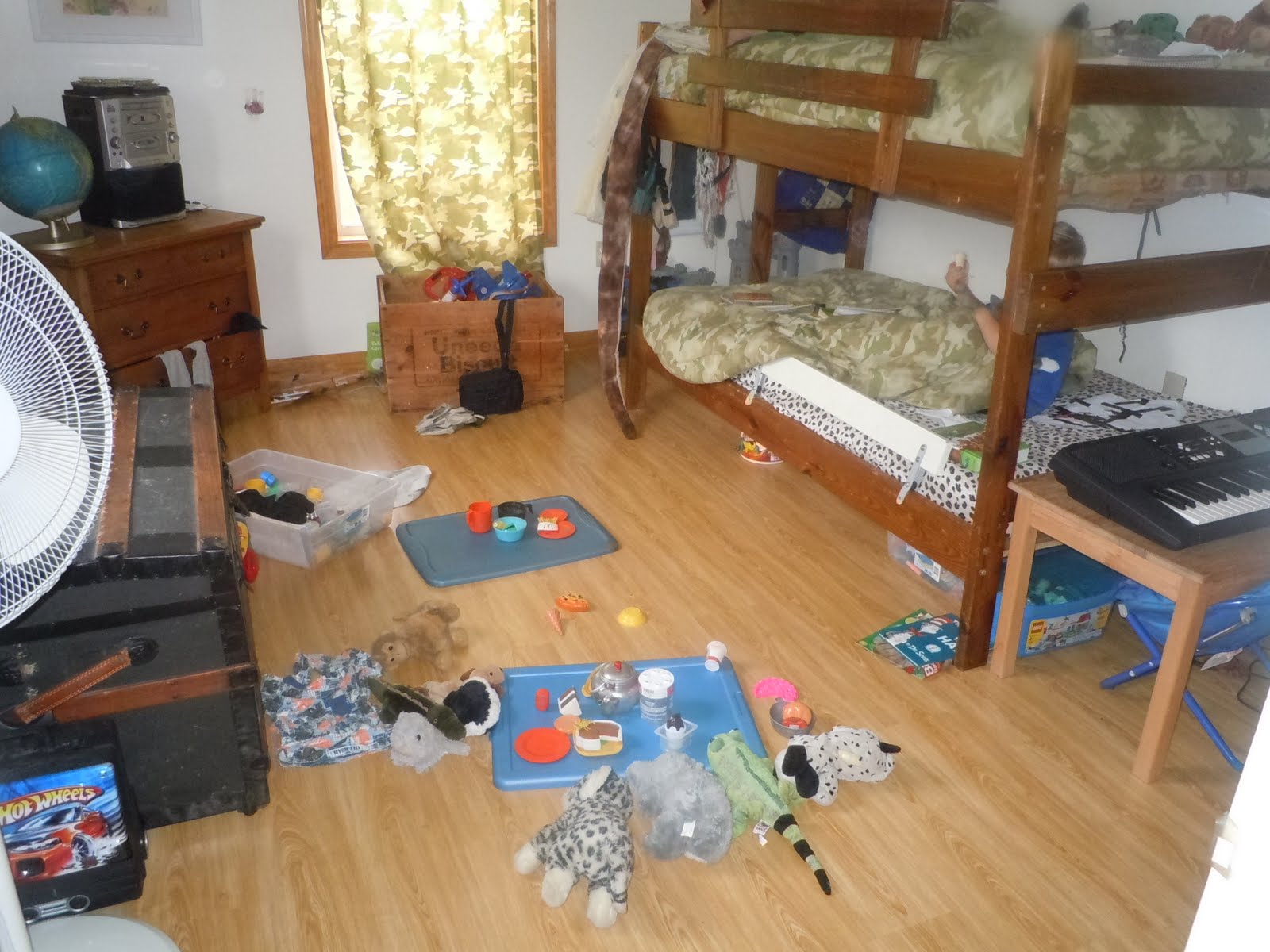 There is usually a kitty on each bed, Kaden is wrapping up his schoolwork, and Jesse is looking at books - or finding something to cut, or rip, or tie, or destroy.